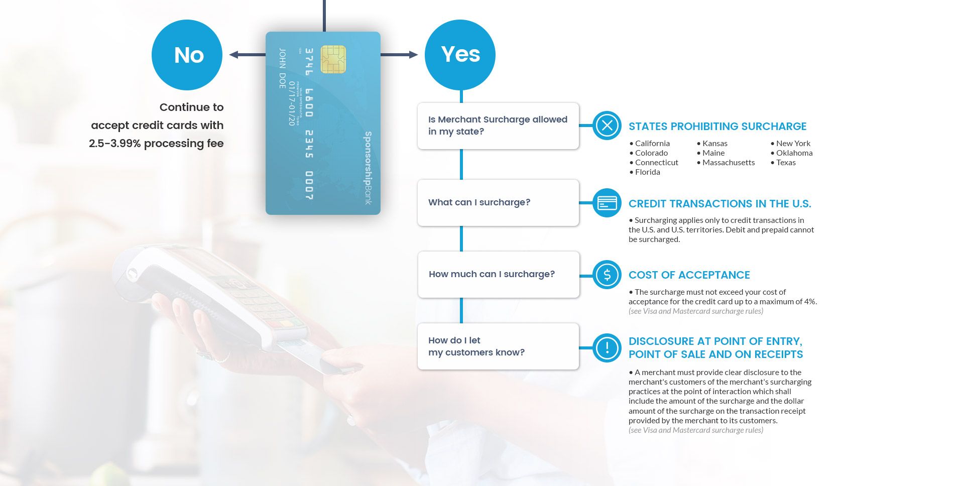As a result of a legal settlement to resolve claims brought by a group of U.S. merchants, merchants in the U.S. and U.S. territories may add a surcharge to certain credit card transactions, starting January 27, 2013. Merchants who choose to surcharge must follow consumer disclosure and other requirements agreed to as part of the settlement.
